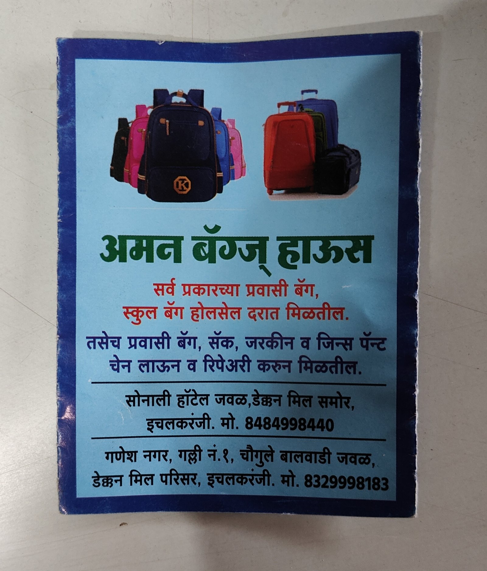 Aman Bag House Sales & Repairing in Ichalkaranji offers a wide range of high-quality bags and expert bag repair services. Whether you're looking for school bags, traveling bags, office bags, or stylish ladies purses and hand purses, we’ve got you covered. With a commitment to durability, design, and affordability, we ensure every product meets your daily needs. If you're searching for bag house sales & repairing near by me, Aman Bag House is your trusted destination. We specialize in restoring old bags to like-new condition with professional repair services. Customers searching for bag house sales & repairing near by me appreciate our quick service, affordable pricing, and wide selection. Since our launch, we’ve become the go-to choice for bag house sales & repairing near by me in Ichalkaranji. Visit us today to explore the latest bag collections and reliable repair solutions.