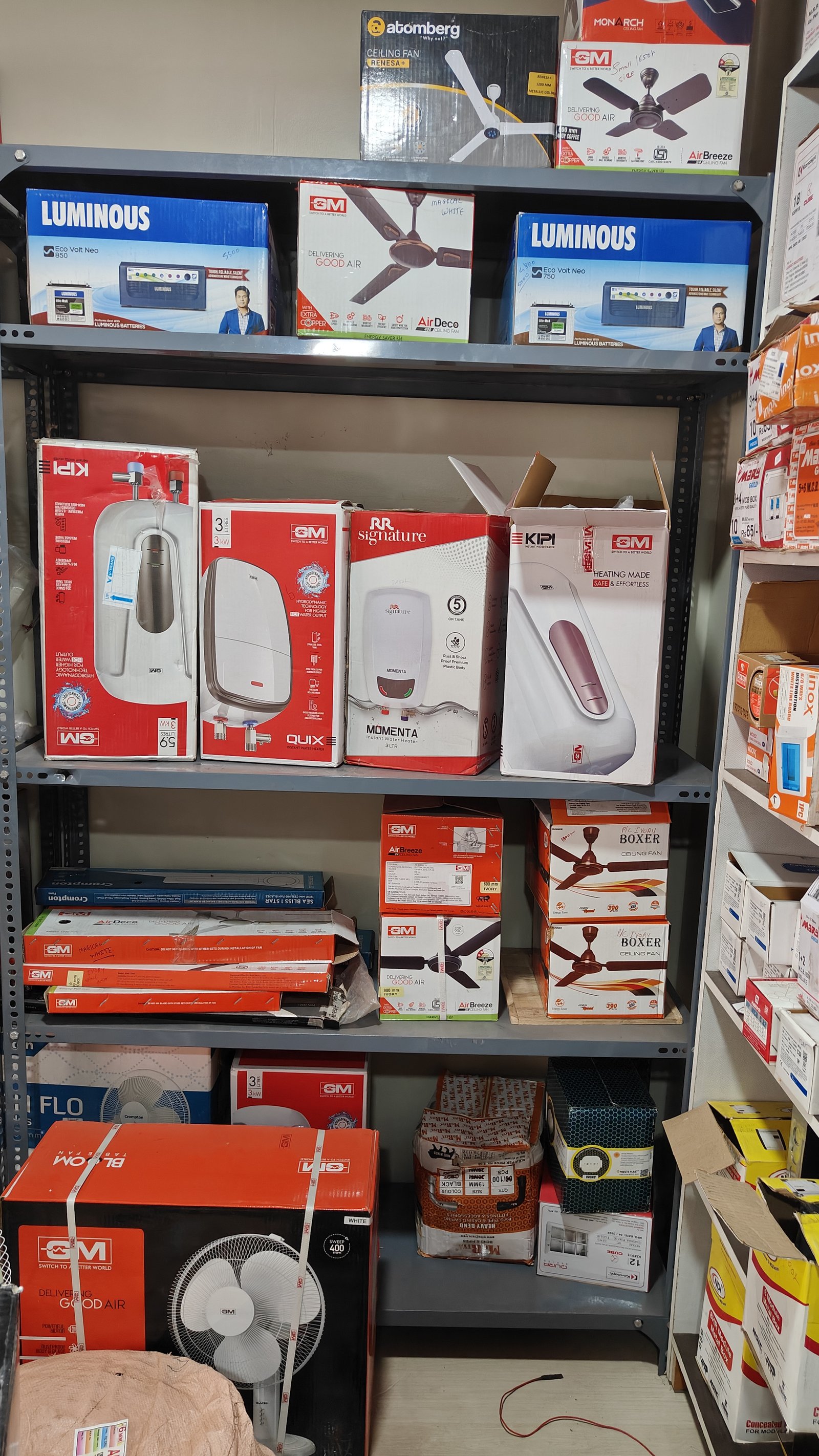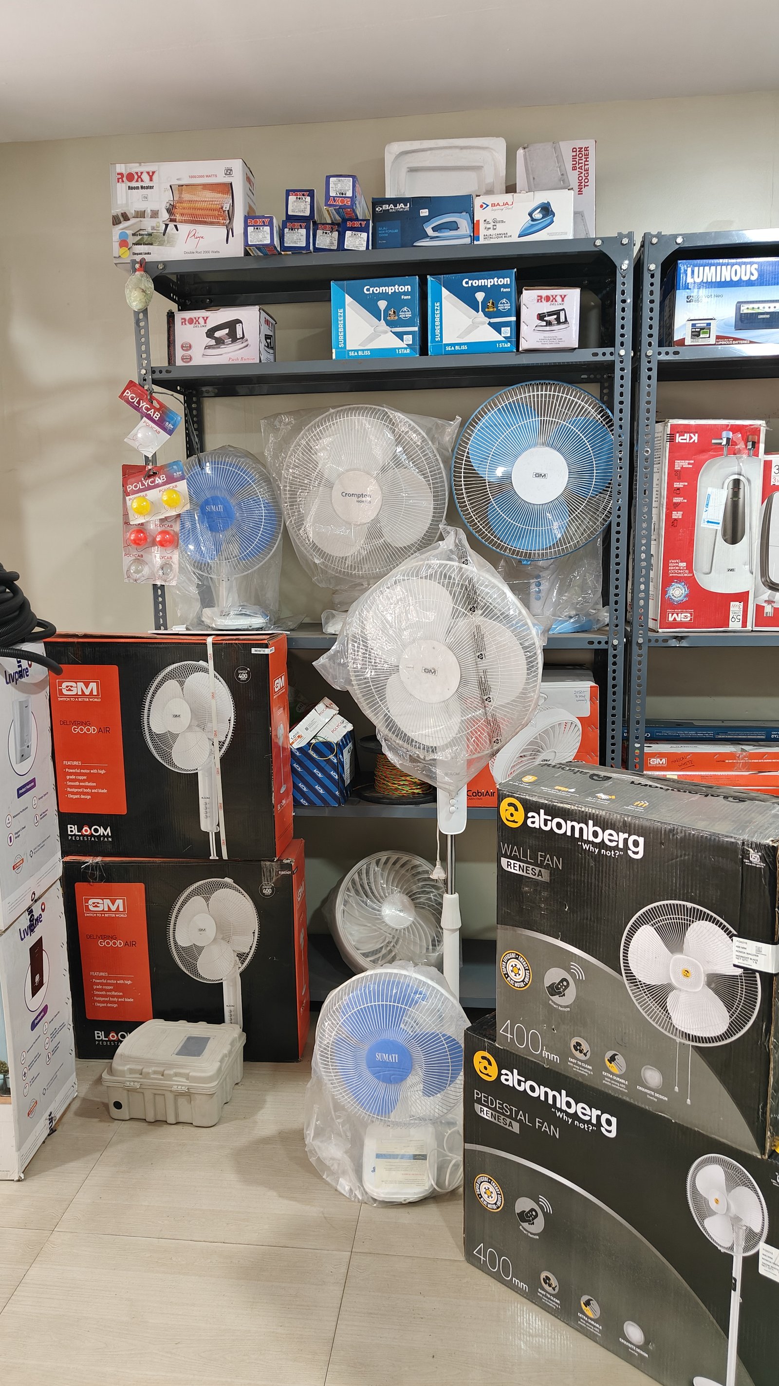 Padmavati Electricals in Ichalkaranji is your trusted destination for all types of branded electrical appliances and accessories. If you're looking for Electricals near by me, we offer a wide range of high-quality products including table fans, wall fans, pedestal fans, and ceiling fans from top brands like GM, Crompton, Atomberg, Havells, and Max. We also stock Luminous inverters and batteries for reliable power backup. For water solutions, we provide motors from Crompton and Kirloskar. Our collection features electrical geysers from GM, Jaguar, RR, and Bajaj.We also supply lighting essentials such as lamps, panels, and decorative lights from Ganit and Wipro. Discover premium cables from Polycab and lighting options like bulbs and tubes from Crompton, Axeon, and Sturlight. Whether for home or commercial use, Padmavati Electricals is the answer when you search for Electricals near by me in Ichalkaranji. Visit us today and experience quality and service you can rely on!